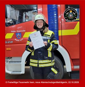 Die Freiwillige Feuerwehr Isen gratuliert Sarah Berndt herzlich zur erfolgreichen Ausbildung zur Atemschutzgeräteträgerin (hat jetzt ein „A“ auf dem Helm). Als Teil eines Atemschutztrupps kann Sarah nun Personen aus verrauchten Gebäuden retten und bei allen Einsätzen Hilfe leisten, bei denen mit Atemgiften zu rechnen ist.